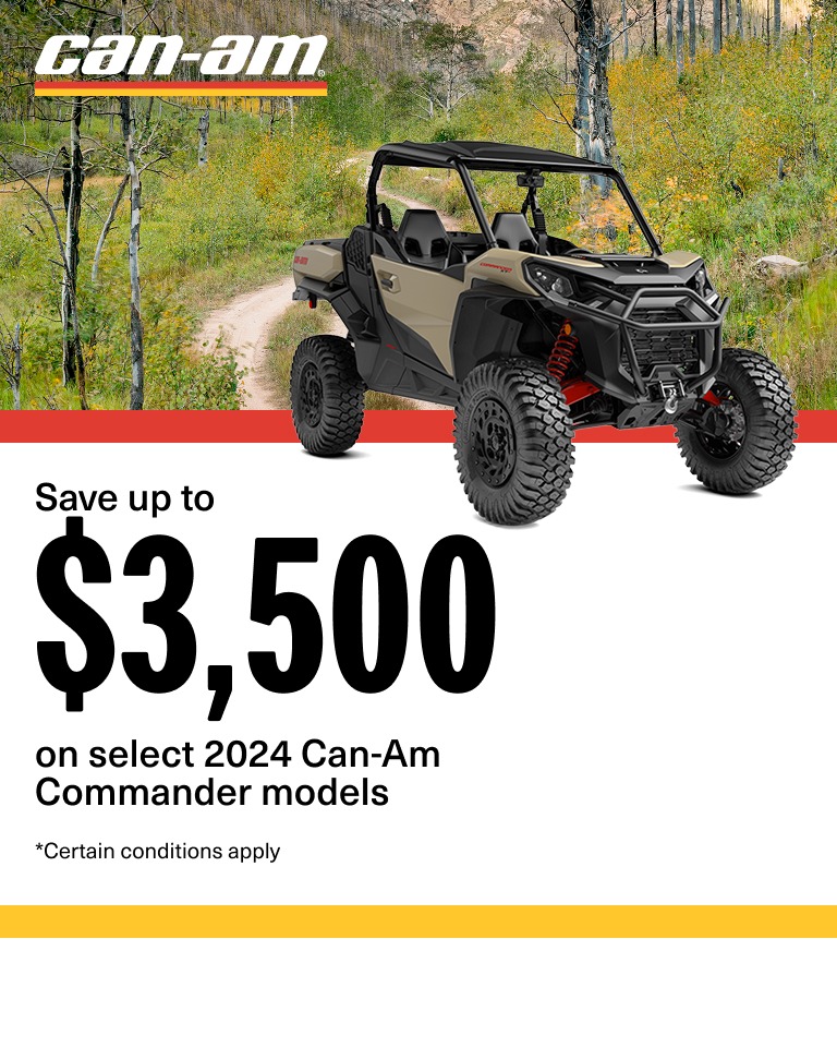 ©2025 Bombardier Recreational Products Inc. (BRP). All rights reserved. ®, ™ and the BRP logo are trademarks of BRP or its affiliates. In the U.S.A., products are distributed by BRP US Inc. Offers valid in U.S.A. only from December 1, 2025 to January 31, 2026. The conditions may vary depending on your location and this offer is subject to termination or change at any time without notice. This offer is not refundable, exchangeable or transferable (including from one dealership to another), cannot be redeemed for cash, credit or other products of equivalent value. Null where prohibited by law. Until supplies last. Eligible units for the announced rebate are all new and unused 2025 Commander 1000R and eligible units for the announced promotional financing are all new and unused 2025 Commander 1000R models. Other Can-Am off-road models may qualify for rebates or promotional financing, see local dealers for details. † Get up to a $4,000 rebate on eligible models: Consumers who purchase an eligible model during the promotional period are eligible for a rebate up to $4,000. †† Financing rates as low as 0% APR (Annual Percentage Rate) for 60 months. Examples of monthly payments required over a 60‑month term at a 0% APR rate: $15 per $1,000 financed. An example of a monthly payment with $3,000 down, no rebate, an APR of 0% for 60 months at an MSRP of $30,000 is $450/mo. Total cost of borrowing $0 with a total repayment obligation of $27,000. Down payment may be required. Other financing offers may be available. Minimum and Maximum Amount Financed may vary. Not all buyers will qualify. Higher rates apply for buyers with lower credit ratings. Other qualifications and restrictions may apply, depending on the participating financial institution(s). BRP is not responsible for any of the financing terms and conditions. This offer is in lieu of any other promotion. BRP recommends that all ATV-SSV drivers take a training course. See your dealer or call the ATV Safety Institute at 1-800-887-2887 (USA) or the Canadian Safety Council at 1-613-739-1535 (Canada). ATV and SSV can be hazardous to operate. Never exceed the ATV-SSV’s passenger capacity. All adult model ATV are meant to be used by drivers of age 16 and older. Carefully read the vehicle’s operator’s guide. Follow all instructional and safety material and observe applicable laws and regulations. ATV and SSV are for off-road use only; never ride on paved surfaces or public roads. For your safety, the operator and passenger(s) must wear a helmet, eye protection and applicable protective clothing. Always remember that riding and alcohol/drugs don’t mix. Never engage in stunt driving. Avoid excessive speed and be particularly careful on difficult terrain. Always ride responsibly and safely. See your authorized BRP dealer for details and visit www.can-am.brp.com.