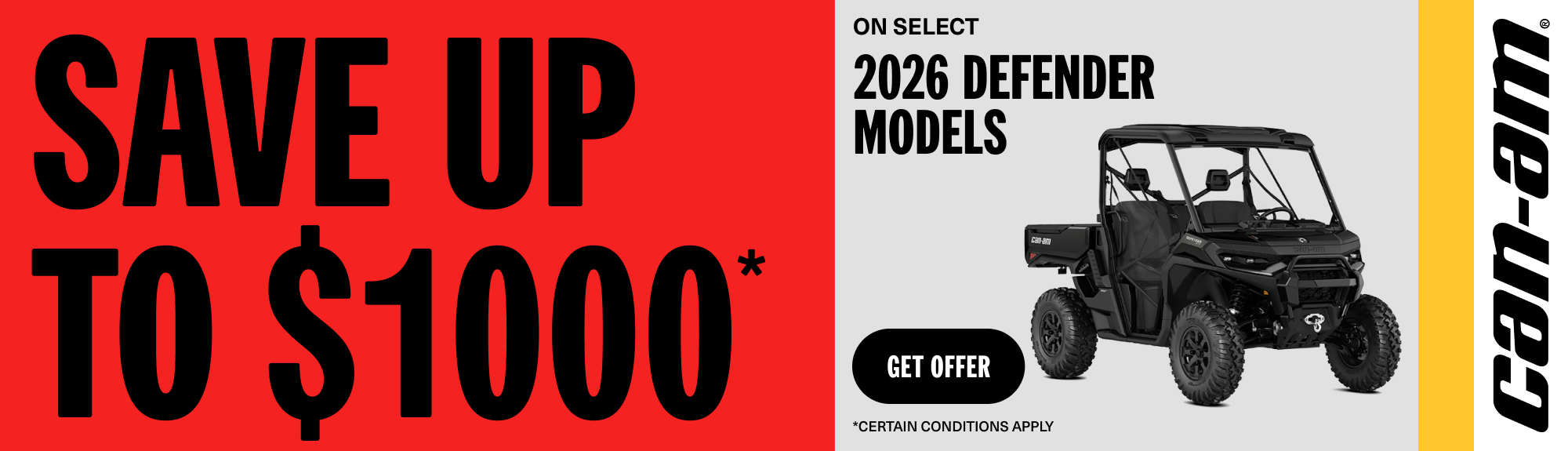©2026 Bombardier Recreational Products Inc. (BRP). All rights reserved. ®, ™ and the BRP logo are trademarks of BRP or its affiliates. In the U.S.A., products are distributed by BRP US Inc. Offers valid in U.S.A. only from February 1, 2026 to February 28, 2026. The conditions may vary depending on your location and this offer is subject to termination or change at any time without notice. This offer is not refundable, exchangeable or transferable (including from one dealership to another), cannot be redeemed for cash, credit or other products of equivalent value. Null where prohibited by law. Until supplies last. Until supplies last. Eligible units for the announced rebate are all new and unused select 2026 Defender HD10 and HD11 and eligible units for the announced promotional financing are all new and unused off-road 2026 models. Other Can-Am off-road models may qualify for rebates or promotional financing, see local dealers for details.