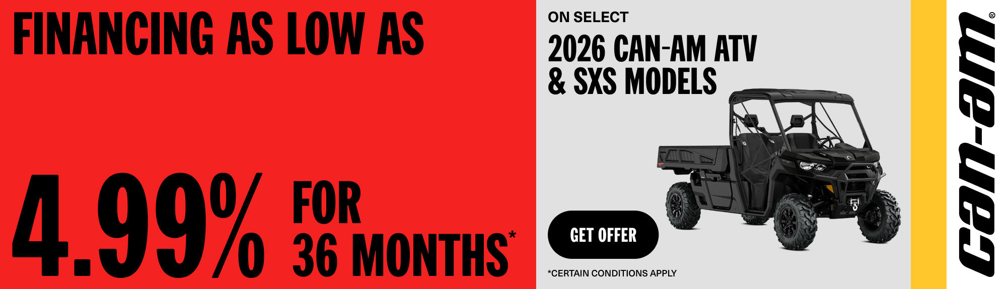 Financing as low as 4.99% for 36 months on select 2026 Can-Am ATV & SXS models